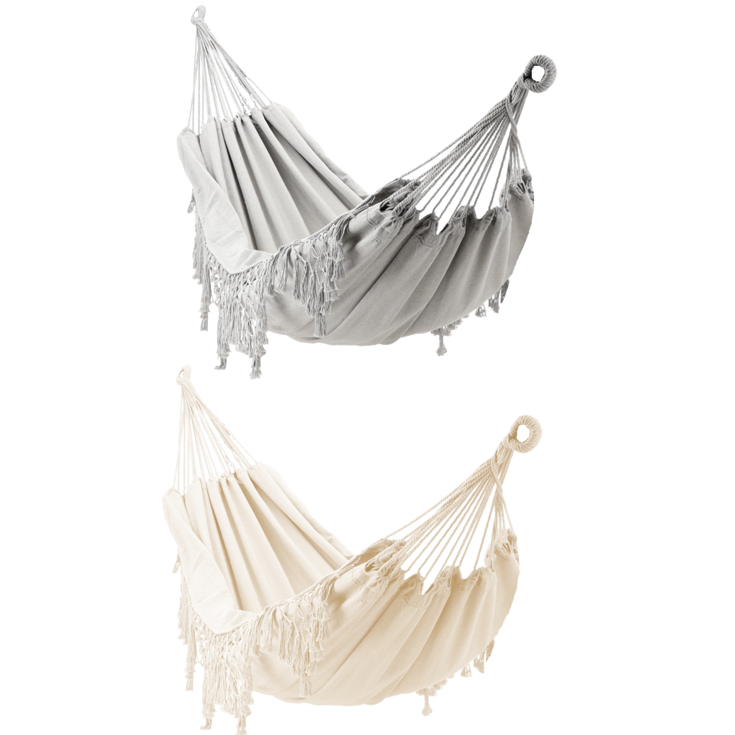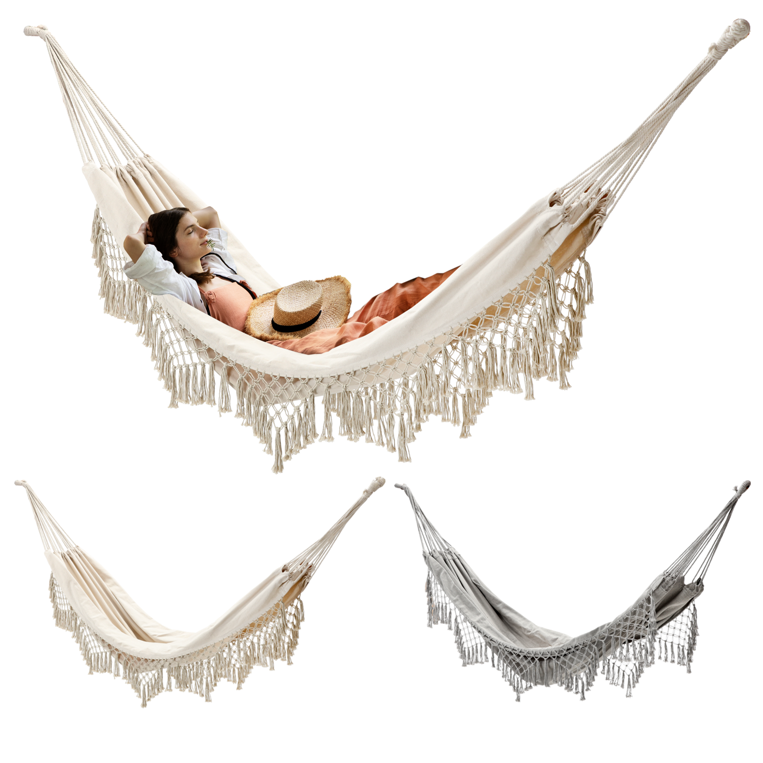 HAMAK Z FRĘDZLAMI BOHO 200 x 150 CM BEŻOWY/SZARY 🌿