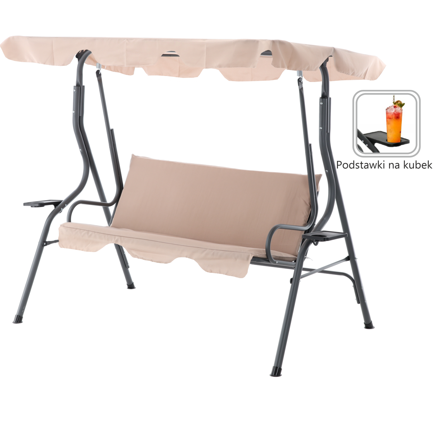 HUŚTAWKA OGRODOWA 170 × 110 × 153 CM – CIEMNY BEŻ Z PODSTAWKAMI NA KUBEK 🌳