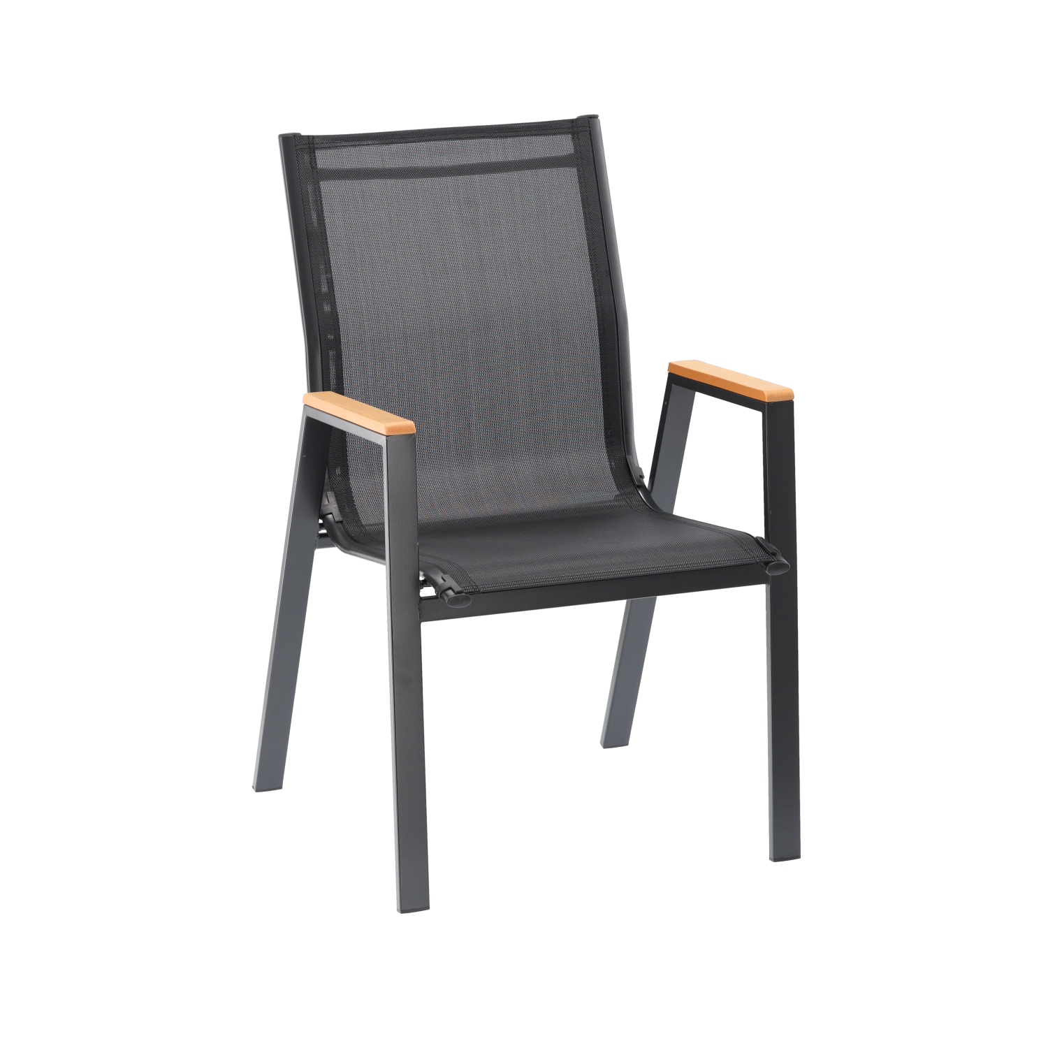 Solidne stalowe krzesło ogrodowe z siedziskiem Textilene 2×1 i podłokietnikami z polywood. Odporne na warunki atmosferyczne, wygodne i stabilne. Idealne do ogrodu, na taras, balkon oraz do przestrzeni komercyjnych.