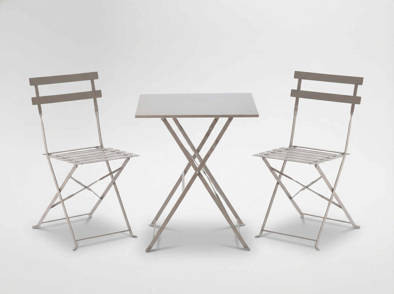 Elegancki i kompaktowy zestaw mebli ogrodowych w kolorze szarym. Stół kwadratowy i dwa krzesła wykonane z wysokiej jakości stali galwanizowanej i malowanej proszkowo, co zapewnia trwałość oraz odporność na warunki atmosferyczne. Idealny do ogrodu, na taras oraz balkon.