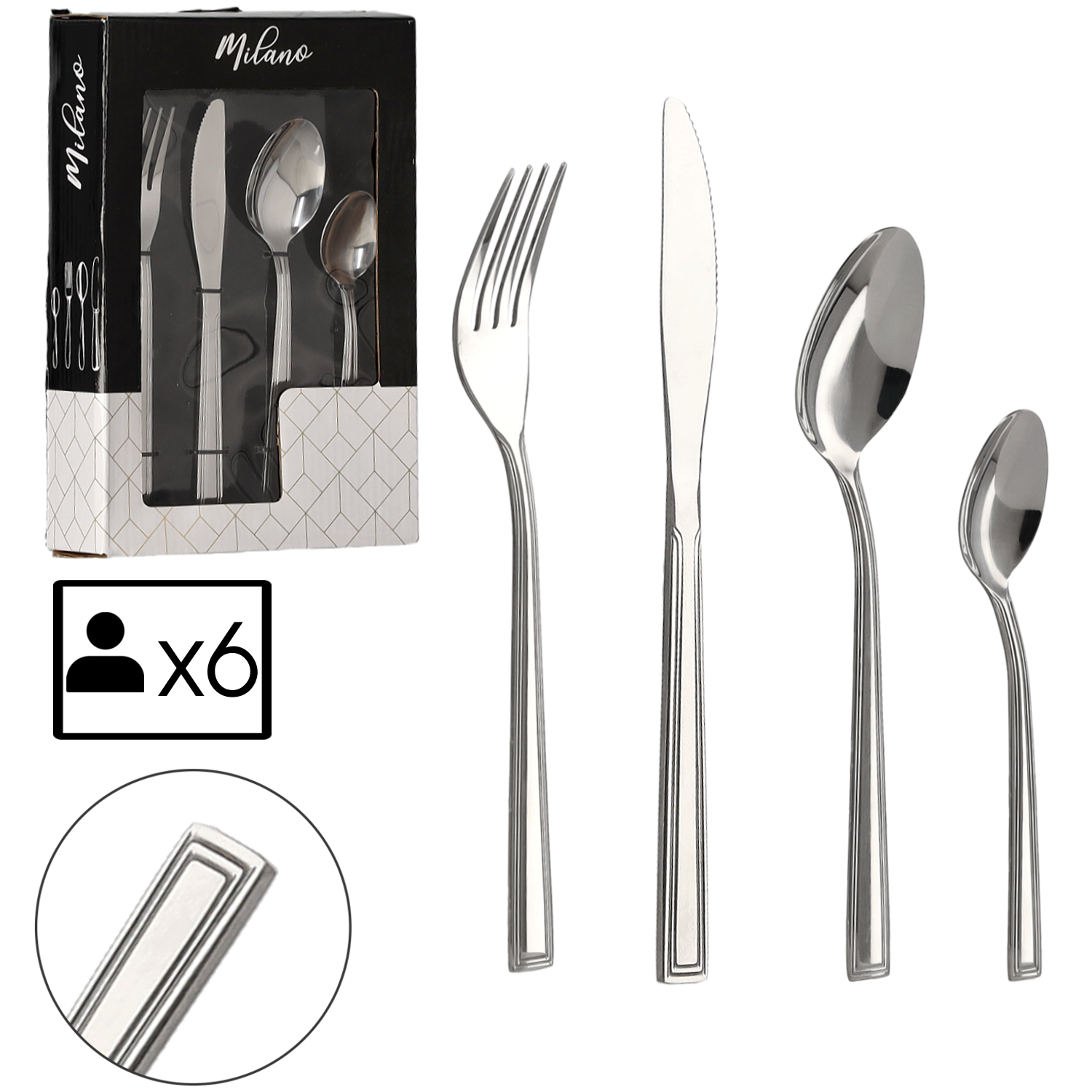 Sztućce „Milano” – komplet 24 elementów. Zestaw zawiera po 6 sztuk noży, widelców, łyżek stołowych i łyżeczek do herbaty. Sztućce charakteryzują się klasycznym designem. Prostota i elegancja łączy się tutaj z bardzo dobrą jakością i solidnym wykonaniem.