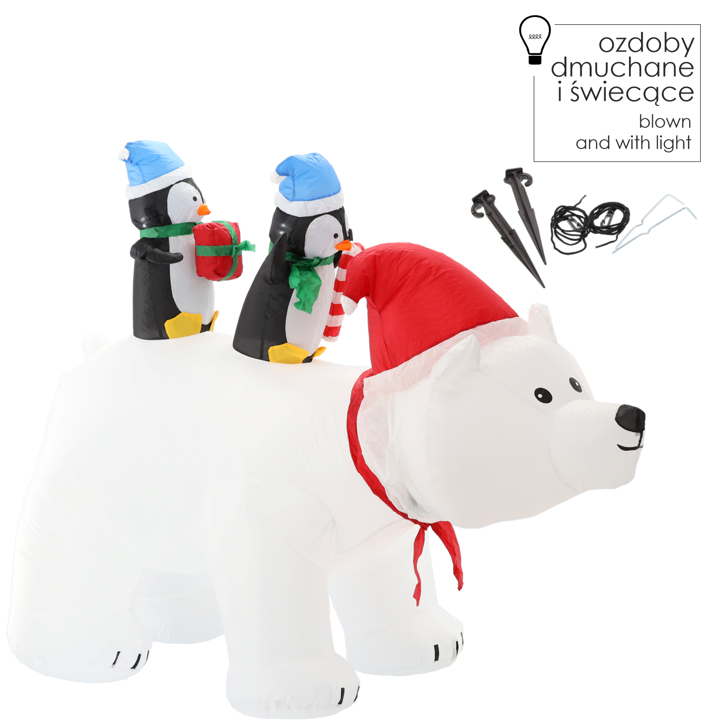 Zanurz się w bajkowy klimat świąt z uroczym dmuchanym niedźwiedziem polarnym, który dźwiga na plecach dwa rozkoszne pingwinki! ⛄🐧 Ten aż 2-metrowy gigant nie tylko wywoła uśmiech na twarzy każdego dziecka i dorosłego, ale również rozświetli przestrzeń dzięki aż 4 białym diodom LED. Idealny na zimową scenografię w ogrodzie, przed domem czy w sklepowej witrynie!