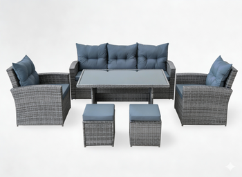 Elegancki i funkcjonalny zestaw mebli ogrodowych, który doskonale sprawdzi się zarówno podczas spożywania posiłków na świeżym powietrzu, jak i chwil relaksu. Dzięki odporności na czynniki atmosferyczne oraz wodoodpornemu rattanowi PE, meble są łatwe w utrzymaniu czystości i zachowują swój wygląd przez długi czas.