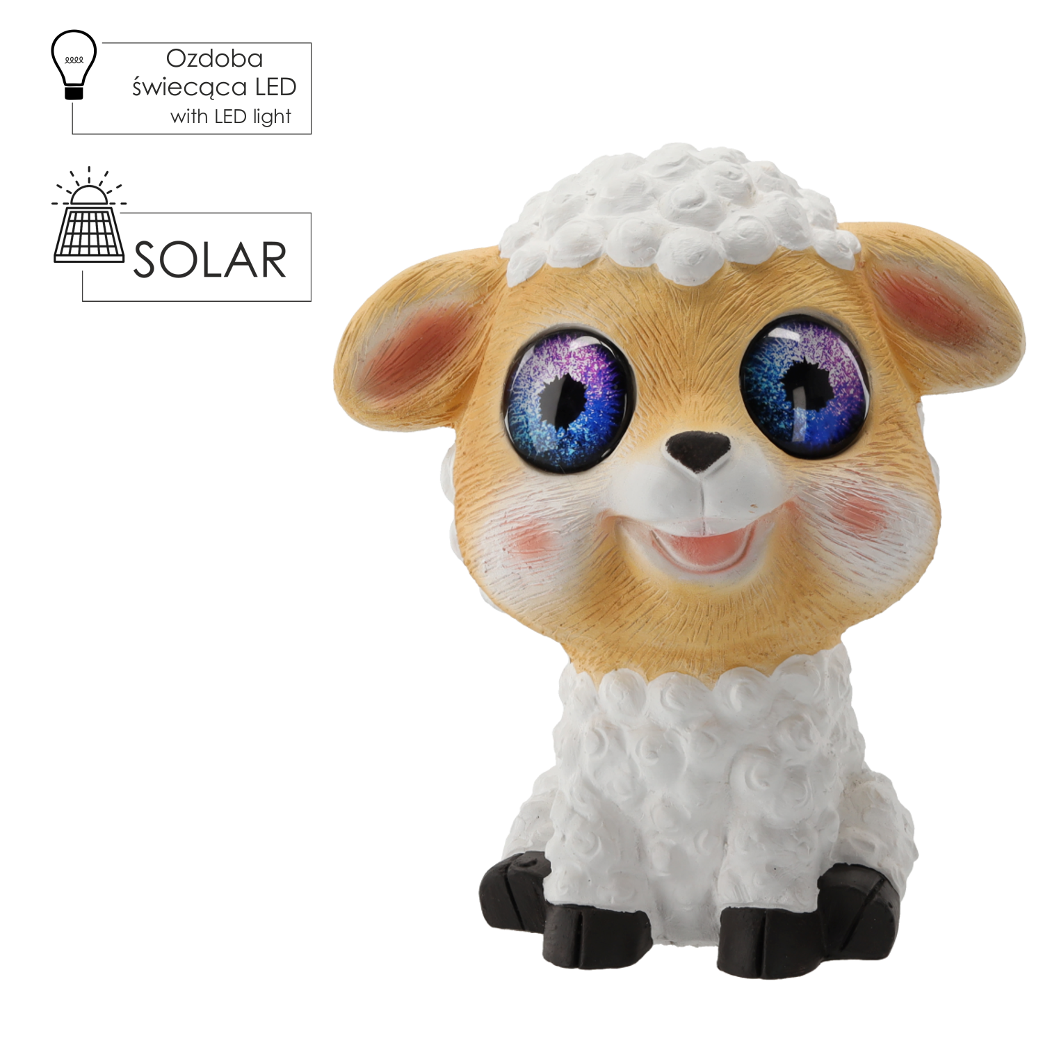 Dekoracyjna figurka owcy z dwoma ciepłobiałymi diodami LED umieszczonymi w oczach. Zasilana energią słoneczną (akumulator 1.2V NiMH 300mAh). Wykonana z trwałego kompozytu magnezu i włókna szklanego (MGO), odpornego na warunki atmosferyczne.