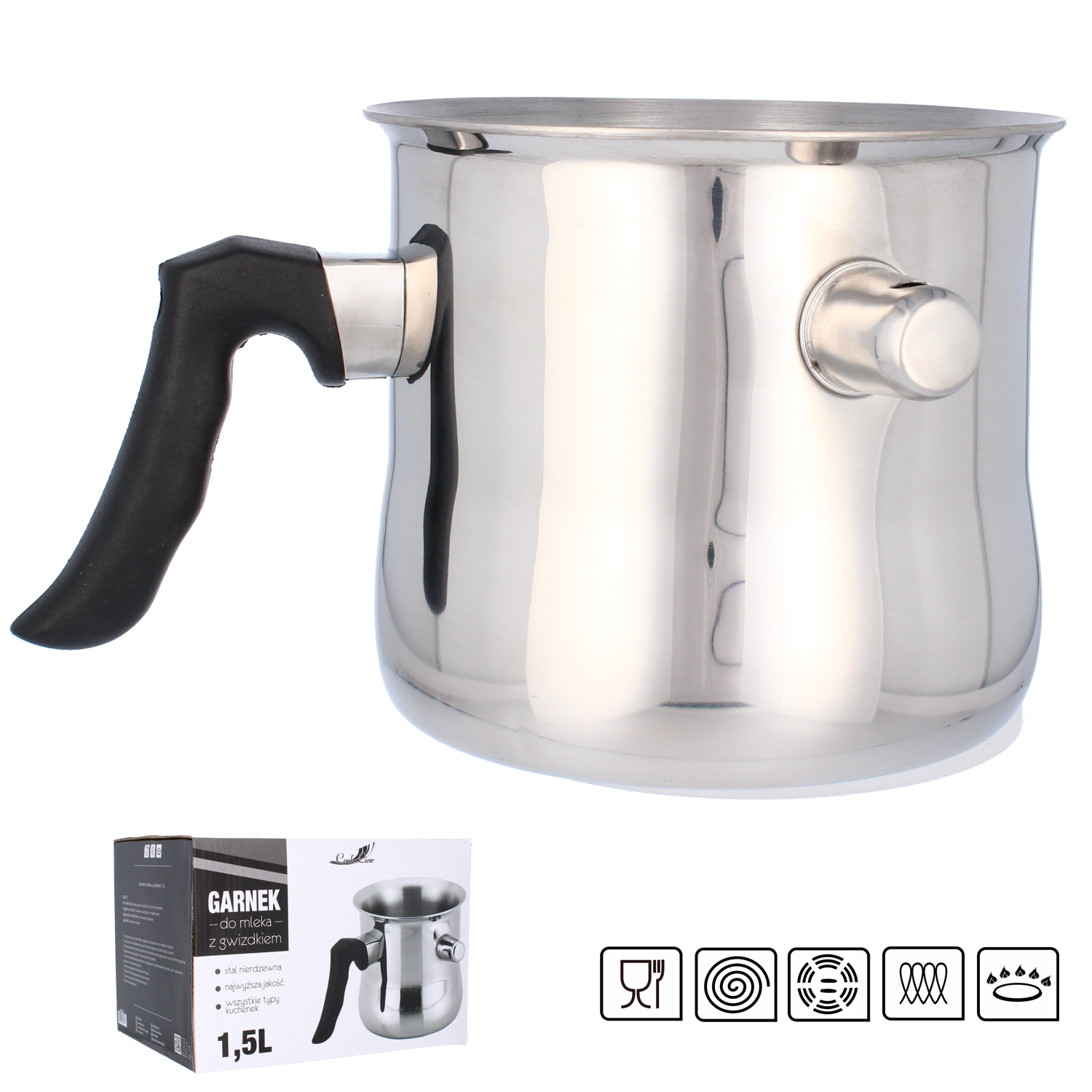 Garnek do mleka z gwizdkiem 1,5l wykonany z wysokiej jakości stali nierdzewnej o grubości 0,5 mm. Wygodny uchwyt z tworzywa sztucznego nie nagrzewa się, dzięki czemu z łatwością przeniesiemy go w dowolne miejsce. Natomiast termiczne dno sprawia, że mleko