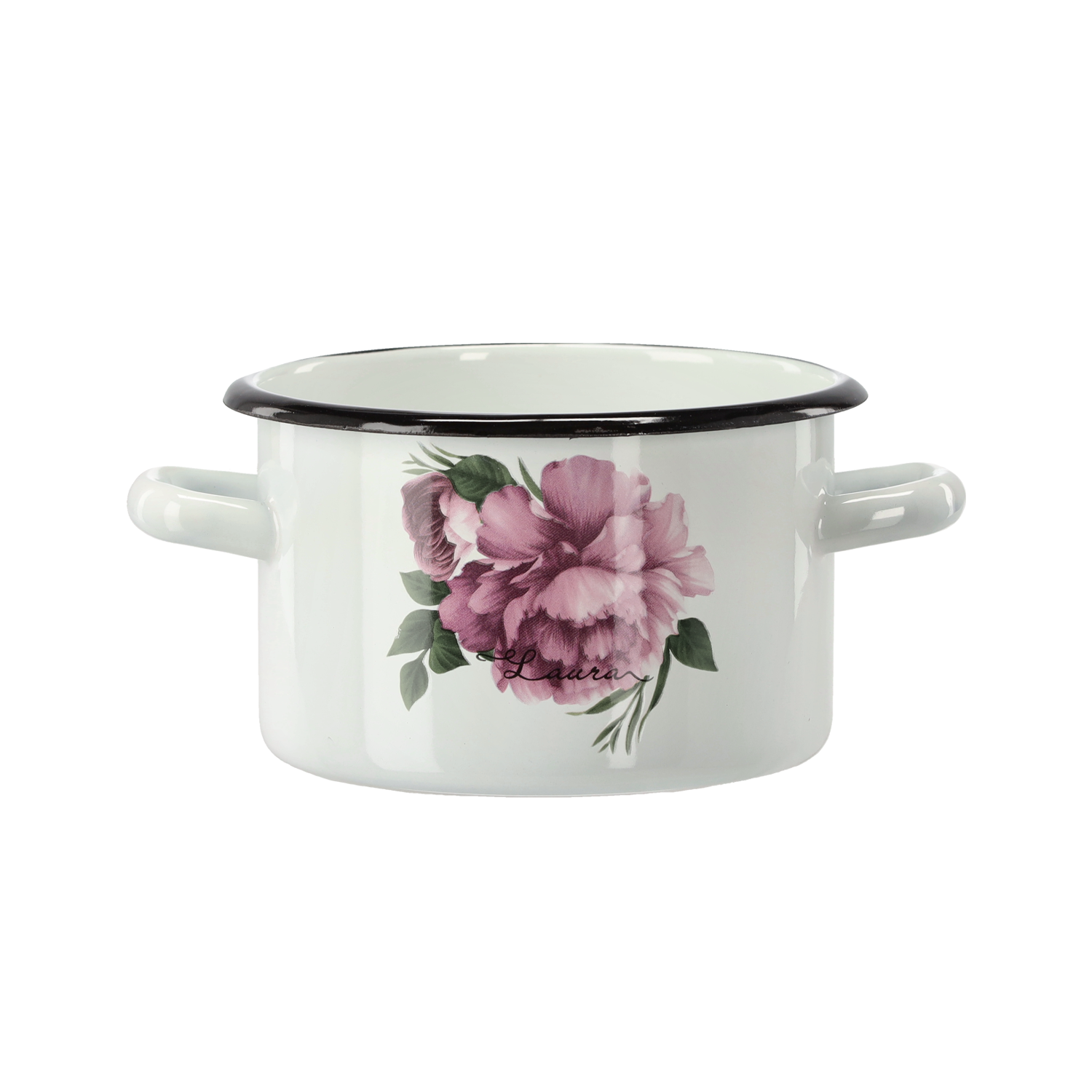Praktyczny garnek emaliowany o pojemności 2 litrów i średnicy 16 cm w białym kolorze z dekoracyjnym wzorem piwonia Laura. Idealny do codziennego gotowania, łączący trwałość z estetyką.
