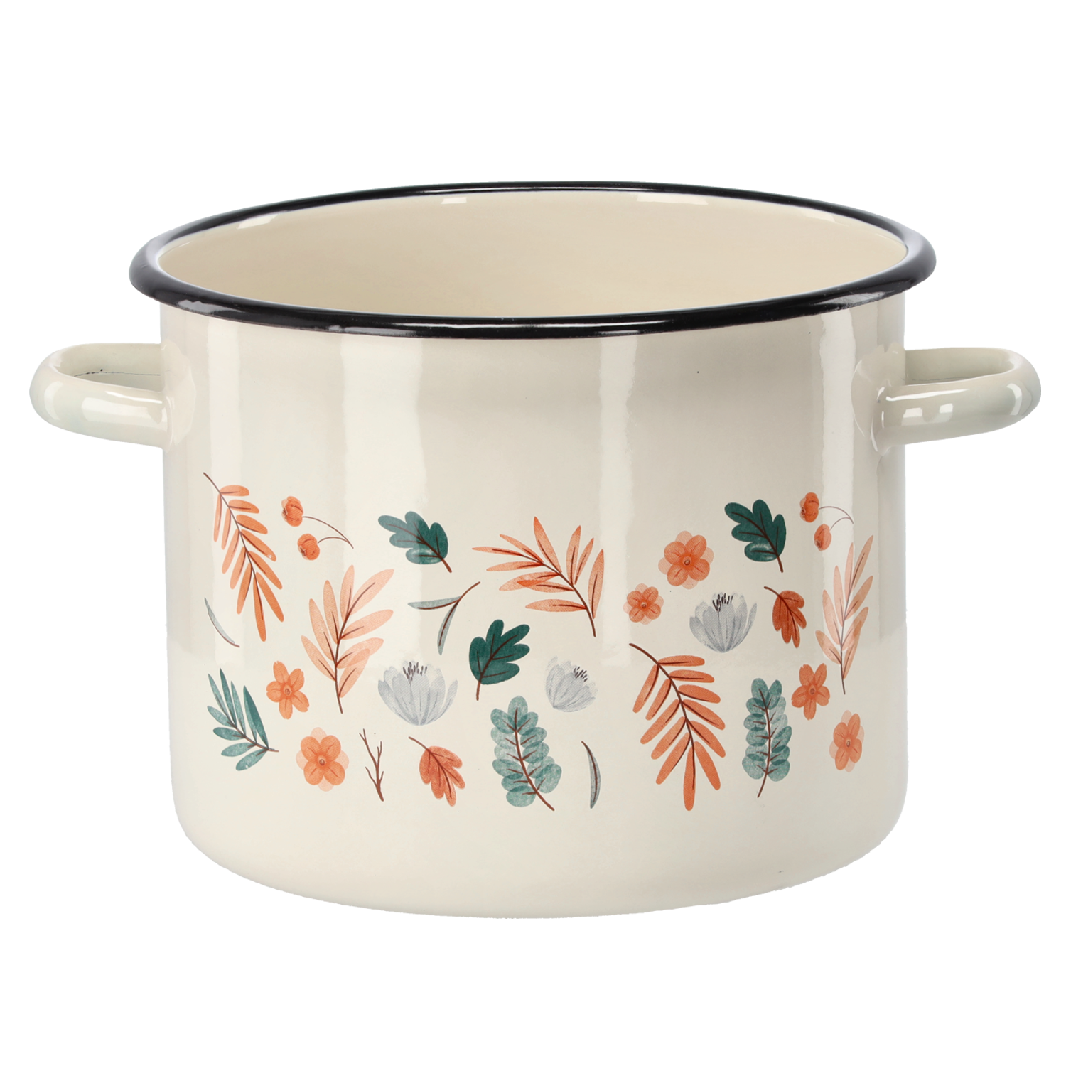 Funkcjonalny garnek emaliowany o pojemności 5,5 litra i średnicy 22 cm w kremowym kolorze z dekoracyjnym wzorem liście. Idealny do codziennego gotowania, łączący trwałość z estetycznym wykończeniem.