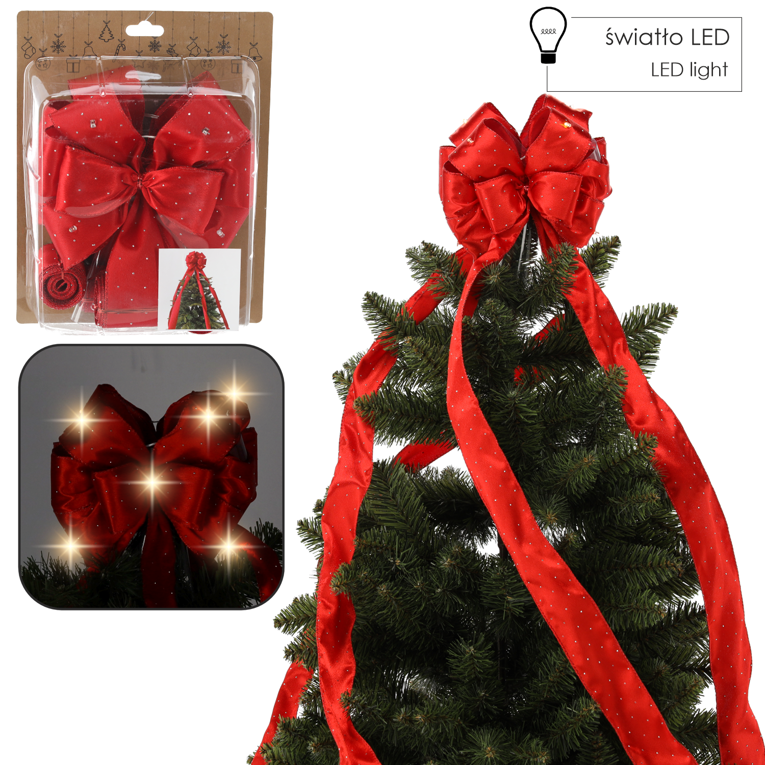 KOKARDA NA CZUBEK CHOINKI CZERWONA SATYNOWA LED 1,8 M *3269
