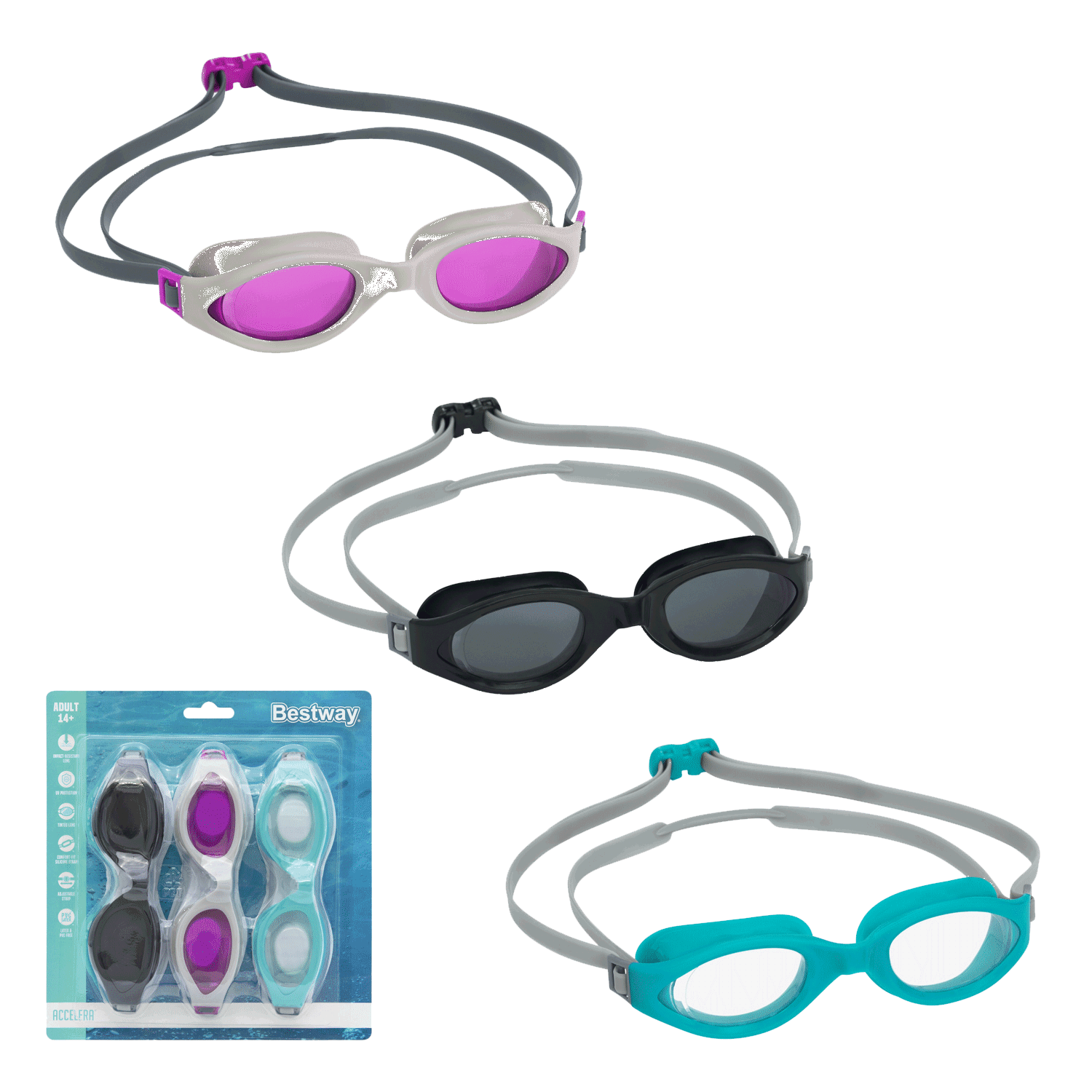 Przyspiesz pływanie i dodaj kolor z parą gogli Bestway® Accelera™! Idealny dla dorosłych w wieku 14 lat i starszych, wybierz jeden z trzech kolorów ze swojego kompletu, w zależności od tego, który pasuje do Twojej energii i napędza Twoje cele na cały dzień.