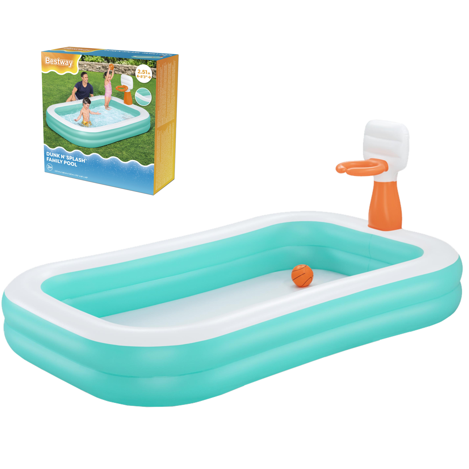 Basen Bestway Dunk n’ Splash™ to idealne rozwiązanie na gorące, letnie dni – stworzony z myślą o rodzinach z dziećmi, które kochają aktywną zabawę i wspólne chwile na świeżym powietrzu. Duża przestrzeń kąpielowa, solidna konstrukcja oraz nadmuchiwany kosz do koszykówki sprawiają, że każda chwila w basenie zamienia się w radosną przygodę. 🌞