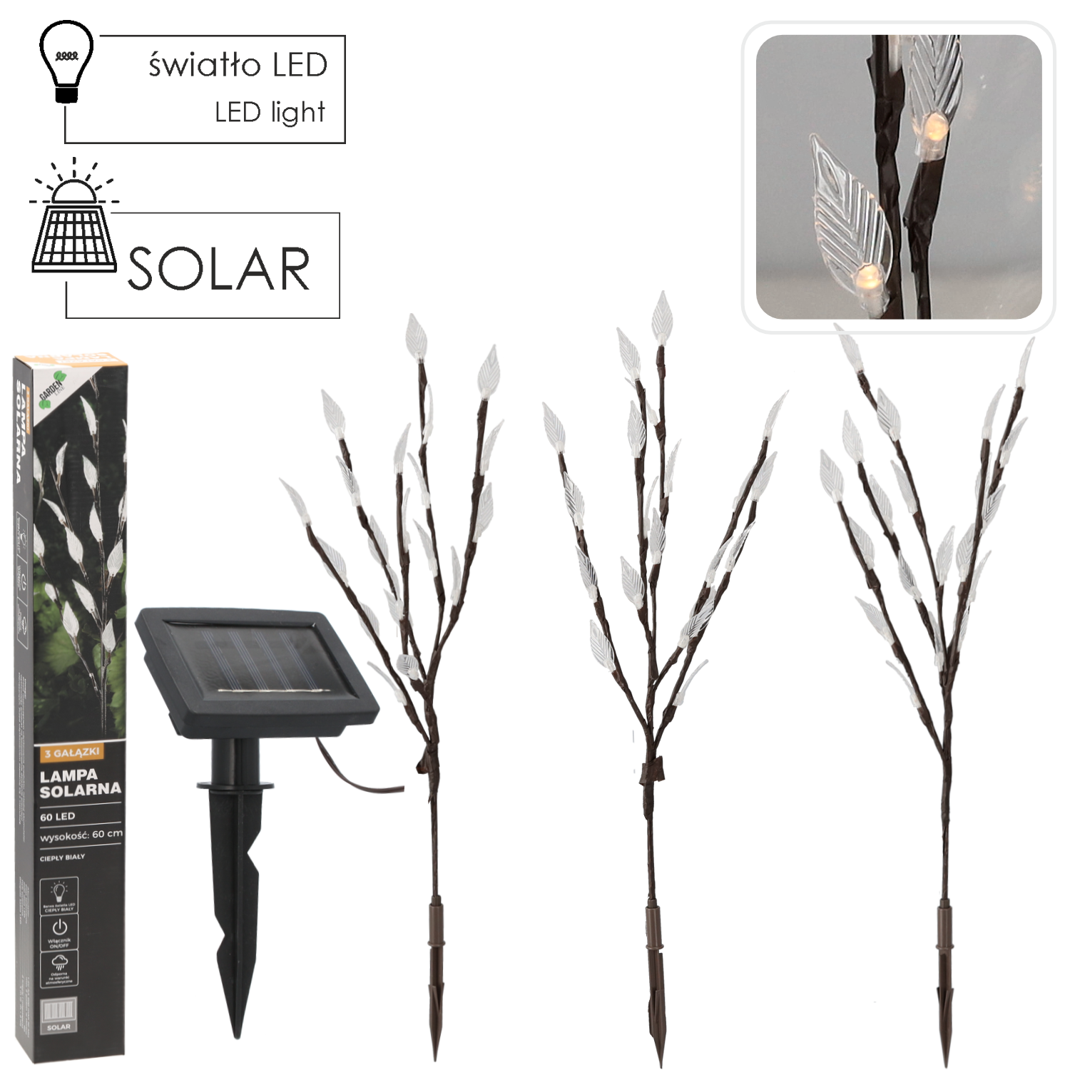 LAMPA SOLARNA H 60 CM 3 GAŁĄZKI 60 LED CIEPŁY BIAŁY *6094