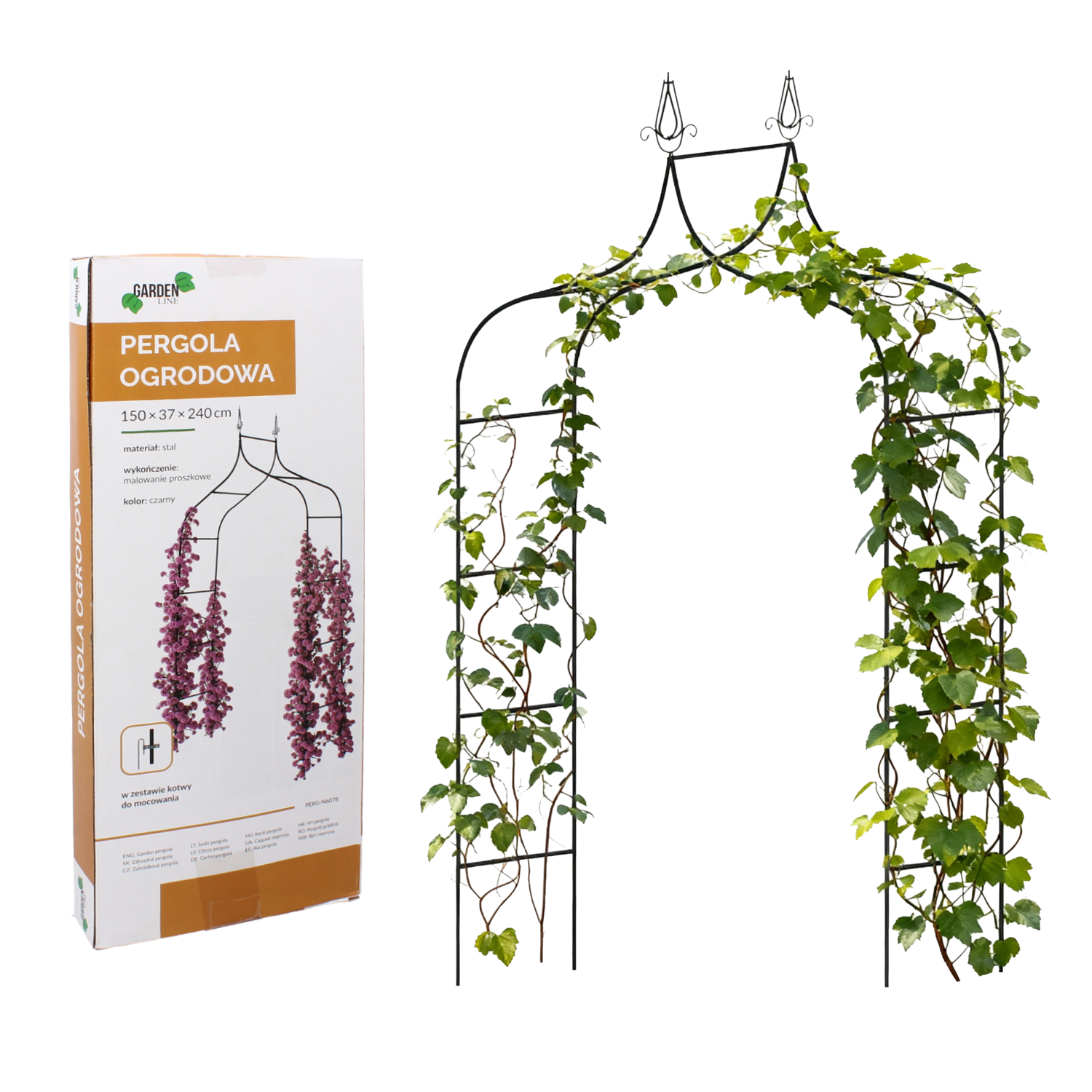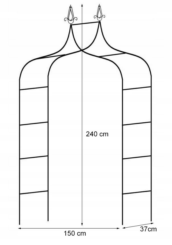 Pergola o wysokości 240 cm posiada dwa dekoracyjne zwieńczenia w postaci grotów. To wyróżnia ją spośród wszystkich innych tego typu pergol dostępnych na rynku. Wykonana z metalu , jest wystarczająco solidna by utrzymać większość pnącz.Szerokość 150 cm i w