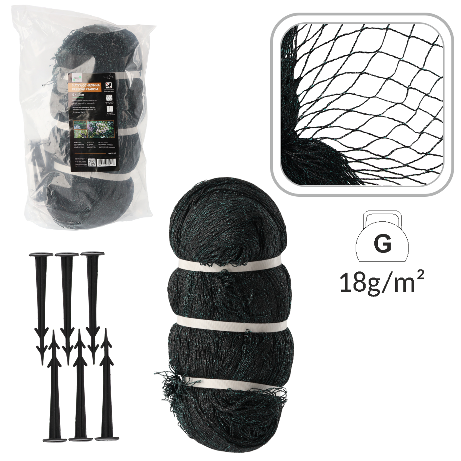 SIATKA OCHRONNA PRZECIW PTAKOM 5x10m (18g/m2) + 10 PLASTIK. SZPILEK *5160