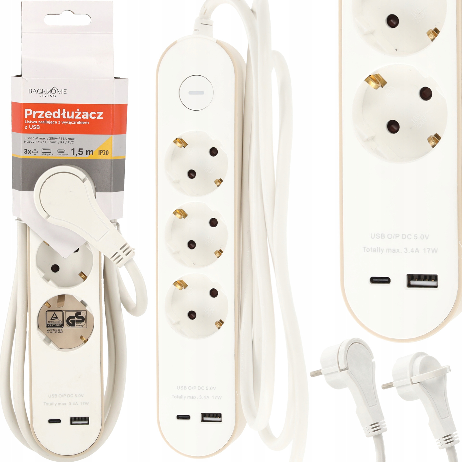 - 3 gniazda typu Schuko – uniwersalne gniazda, które pasują do większości urządzeń domowych i biurowych.