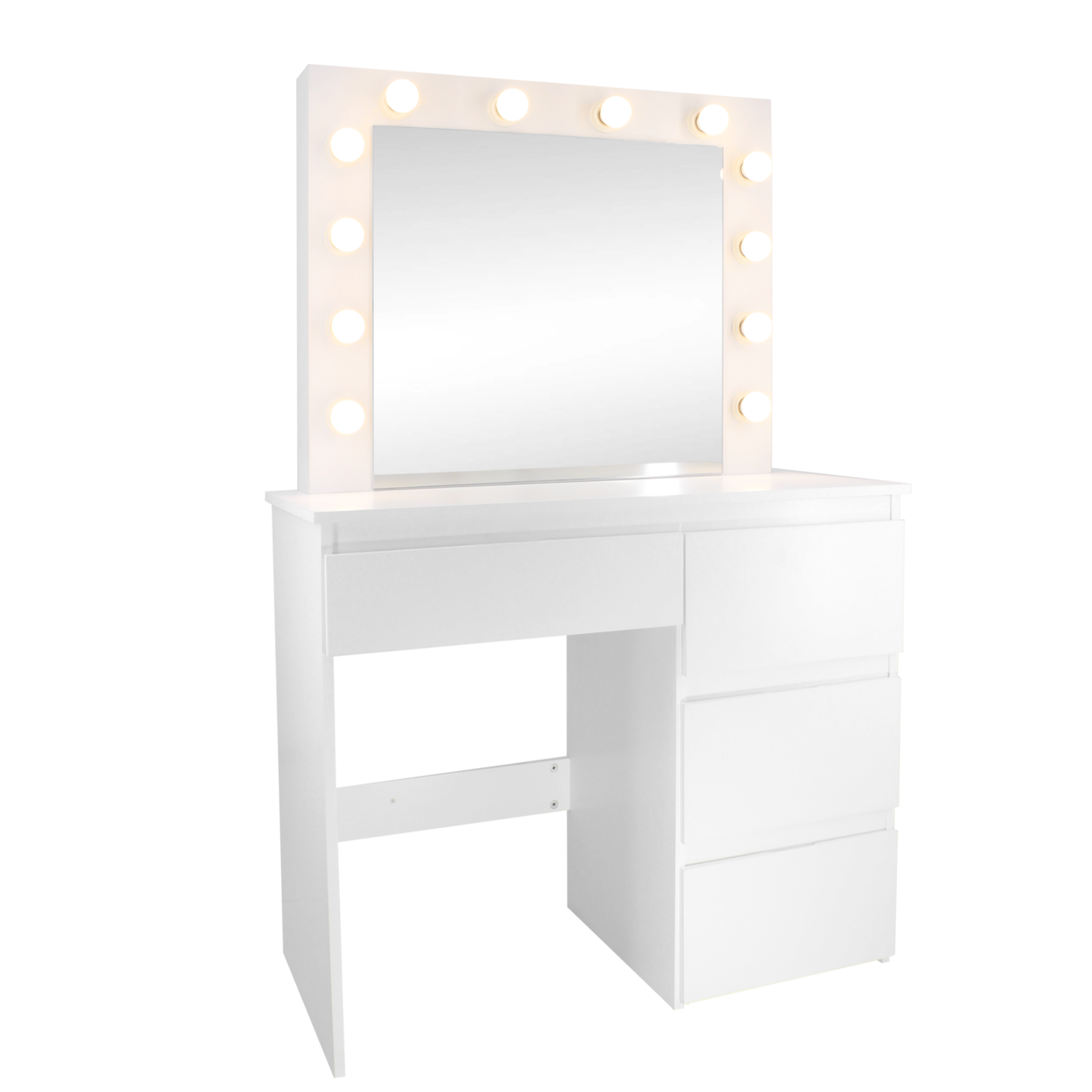 Biała toaletka z oświetleniem. Bardzo funkcjonalna i praktyczna. 4 pojemne szuflady pozwalają na przechowywanie sporej ilości kosmetyków czy biżuterii. Odpowiednio duże lustro i 12 ledowych lampek odpowiadają za wygodę użytkowania.