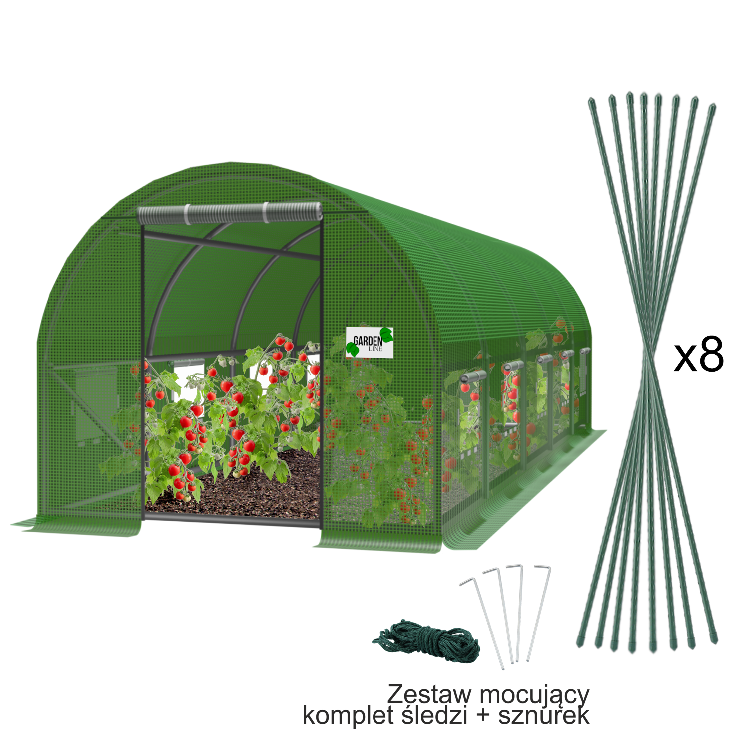 • Dodatki: 8 tyczek 11×120 cm, śledzie, zestaw mocowań