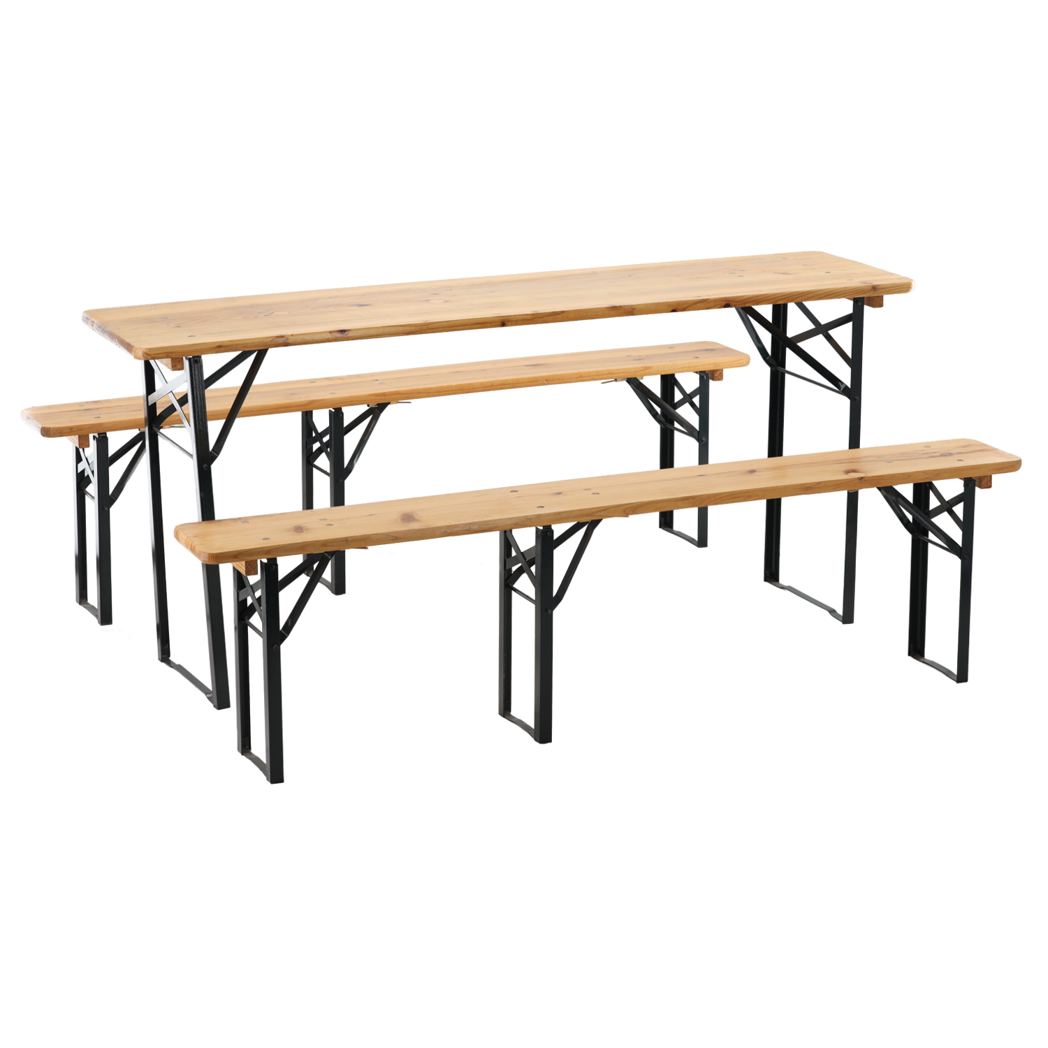 To solidnie wykonany zestaw: stół + dwie ławki, idealny na imprezy plenerowe (festyny, dożynki) i do codziennego użytku w ogrodzie. Drewno sosnowe zostało poddane ciśnieniowej impregnacji i polakierowane, co gwarantuje odporność na warunki atmosferyczne. Rama ze stali malowanej proszkowo zapewnia stabilność i elegancki wygląd.
