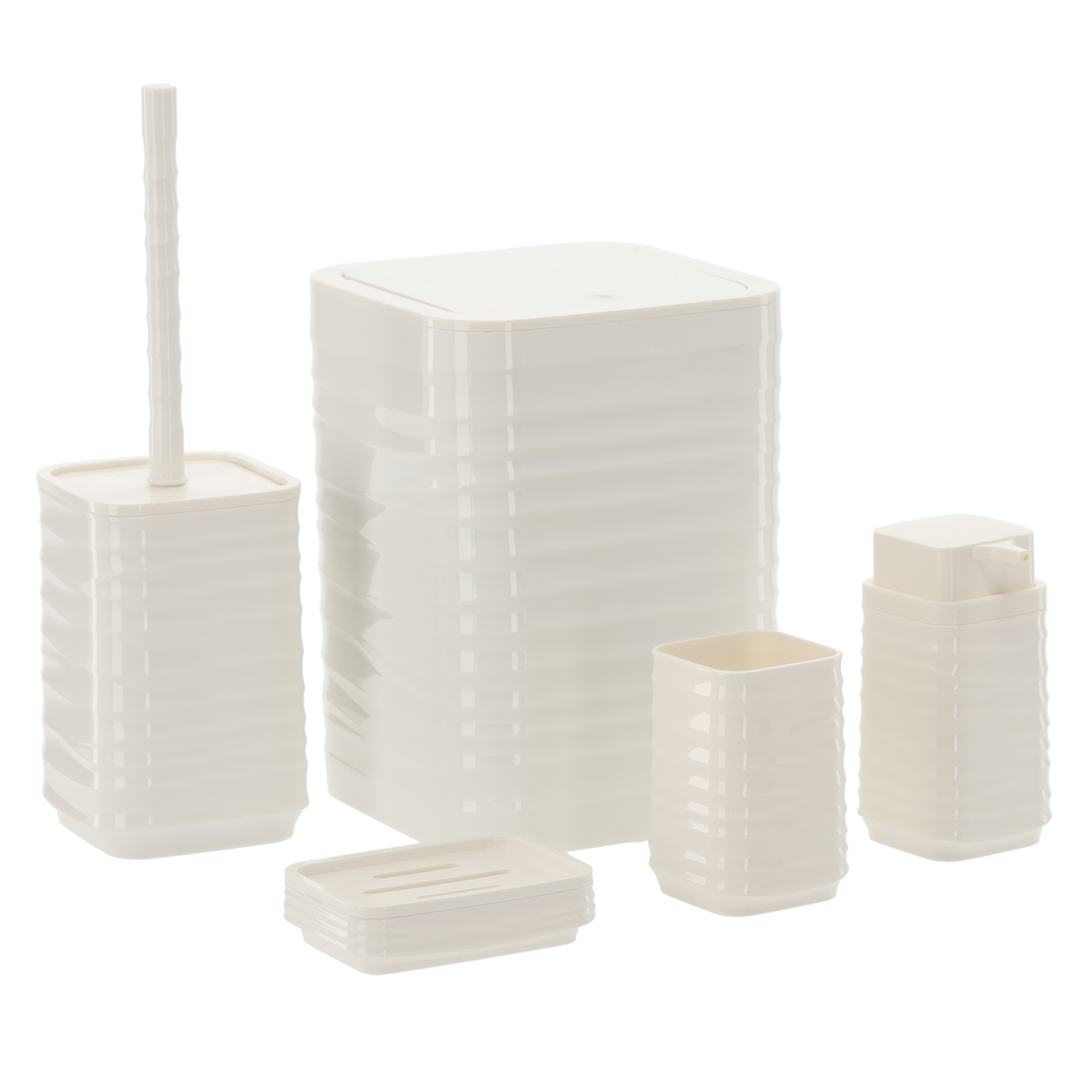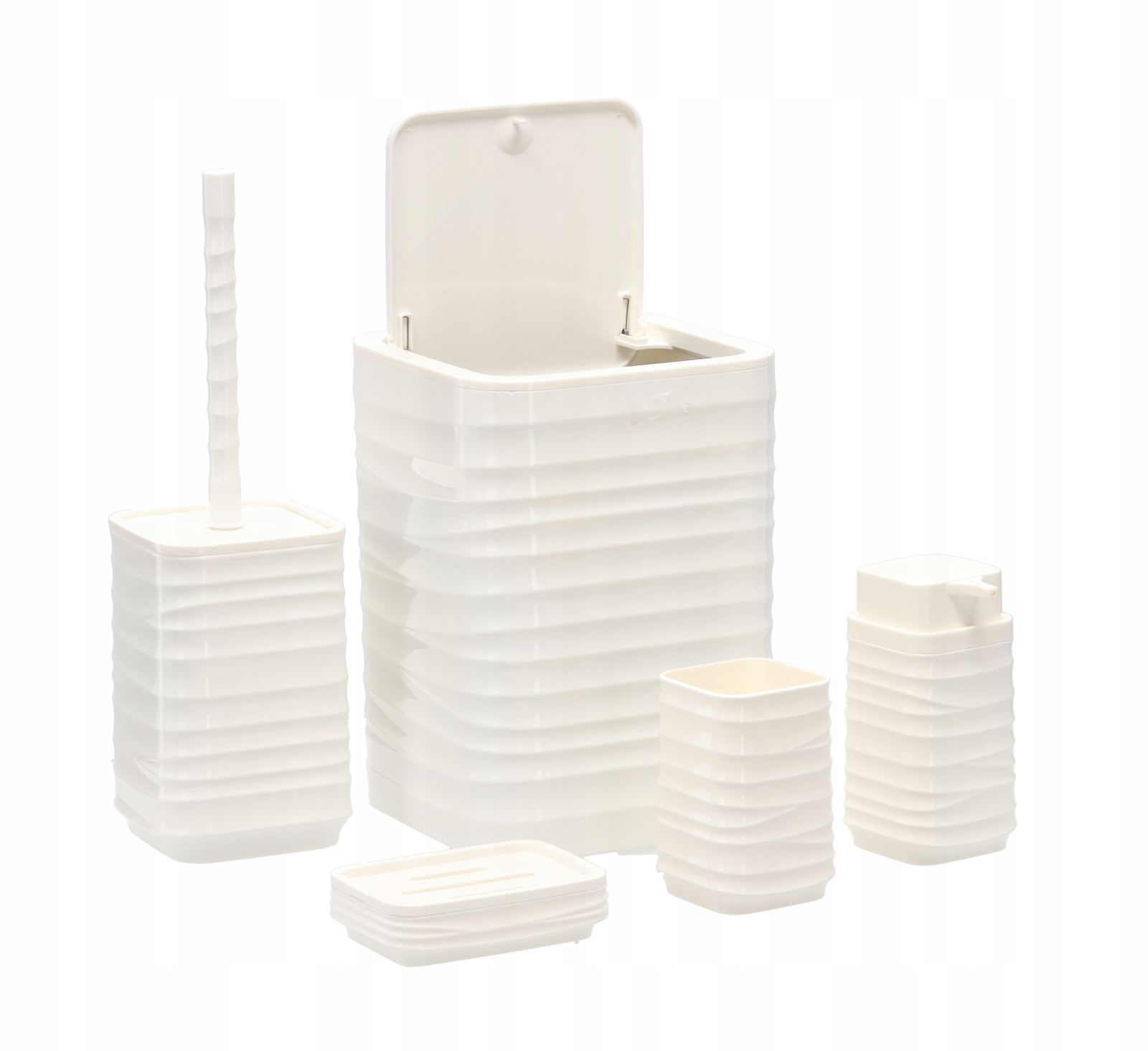 Zestaw łazienkowy 5- elementowy kwadratowy w kolorze białym, wykonany z tworzywa sztucznego.