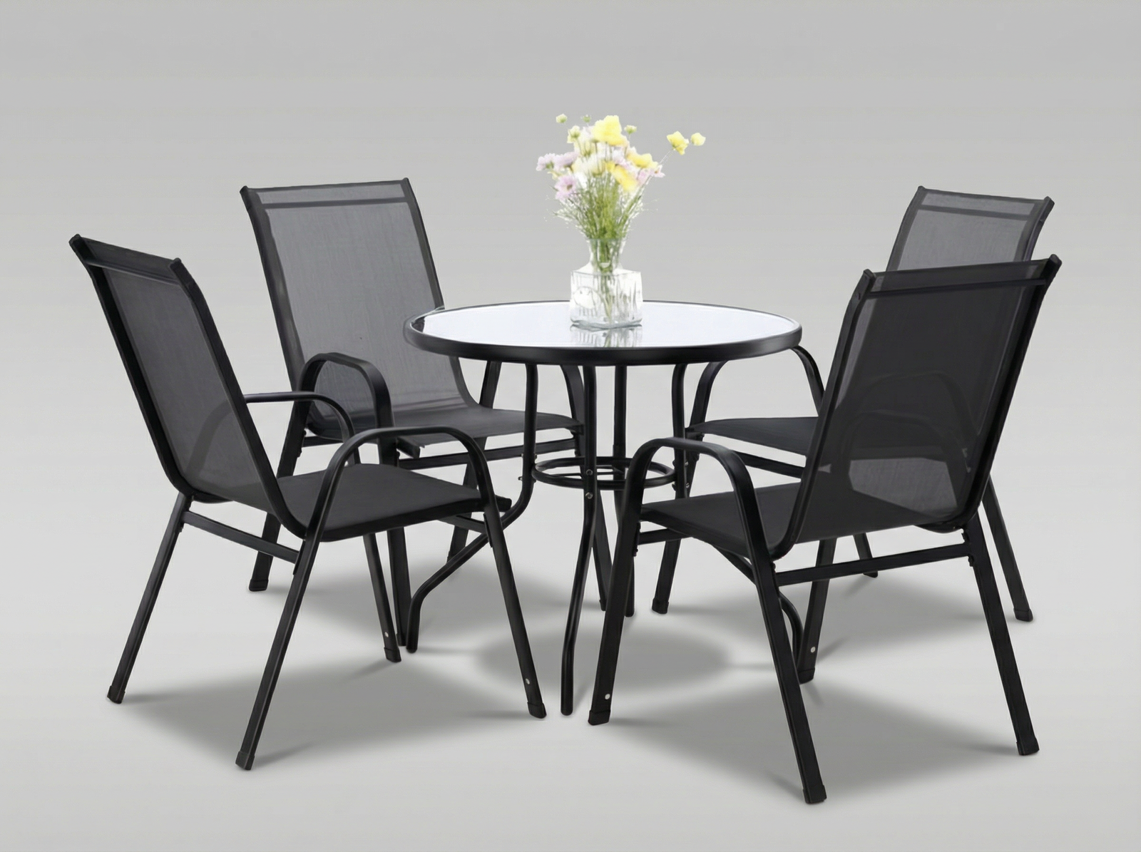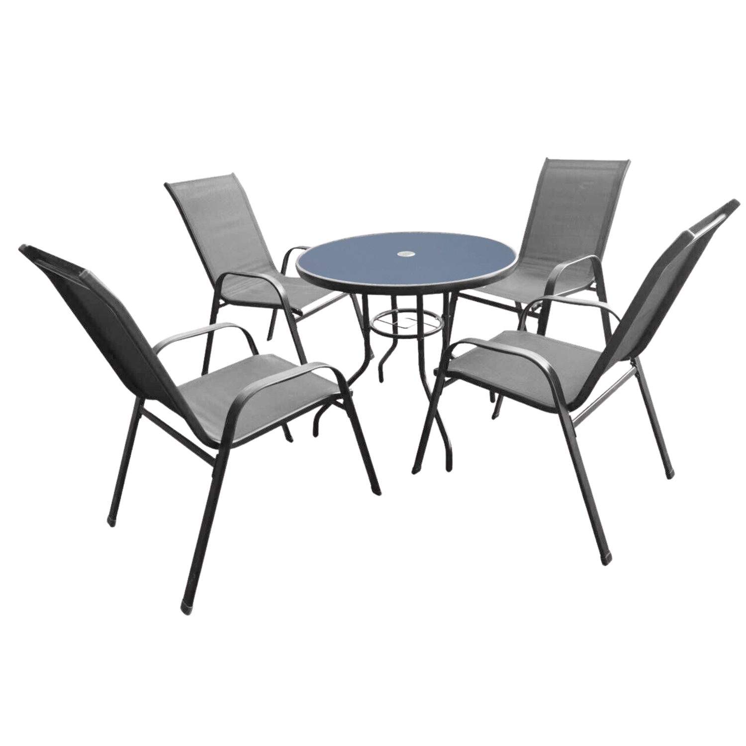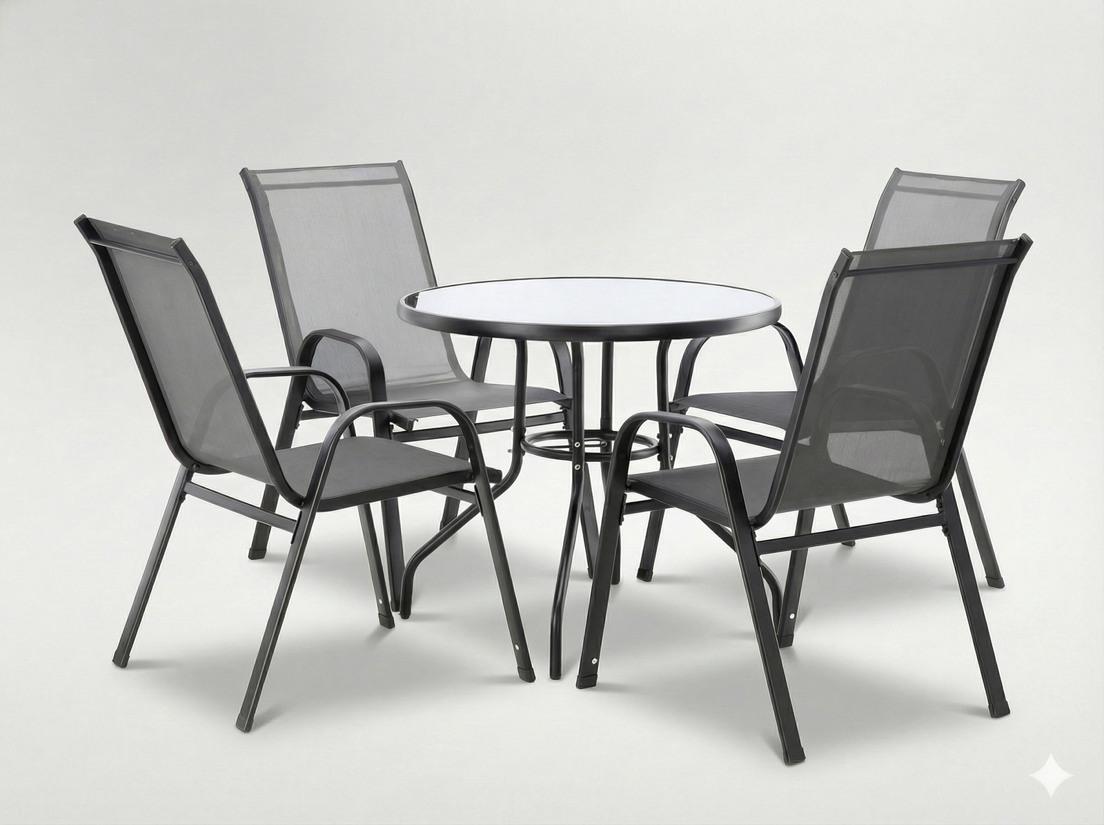 Zestaw mebli ogrodowych w kolorze szarym, składający się z czterech wygodnych krzeseł oraz eleganckiego, okrągłego stolika ze szklanym blatem. Dzięki solidnej konstrukcji i zastosowaniu trwałych materiałów, zestaw idealnie sprawdzi się na tarasie, balkonie lub w ogrodzie. Praktyczne wymiary i nowoczesny design gwarantują komfort użytkowania i estetyczny wygląd przez długi czas.