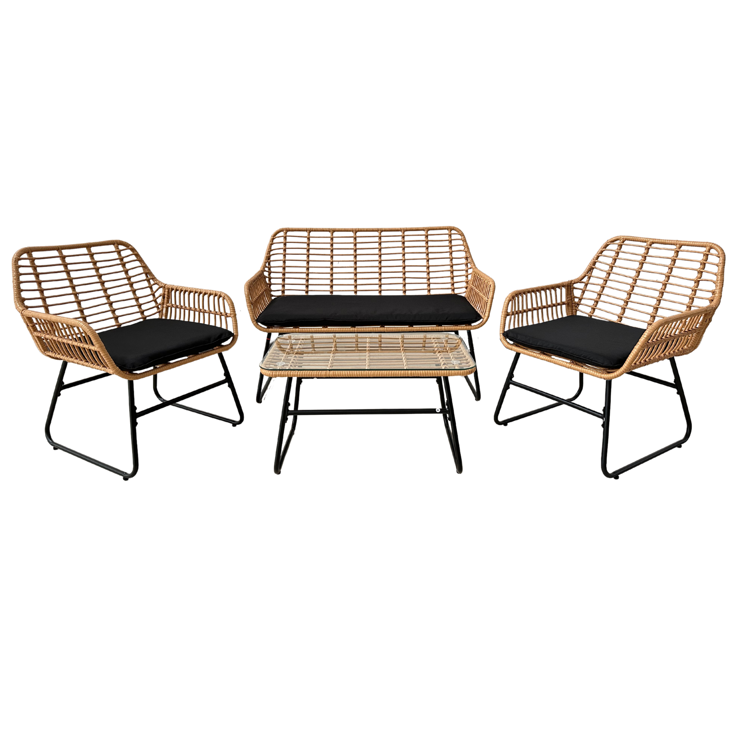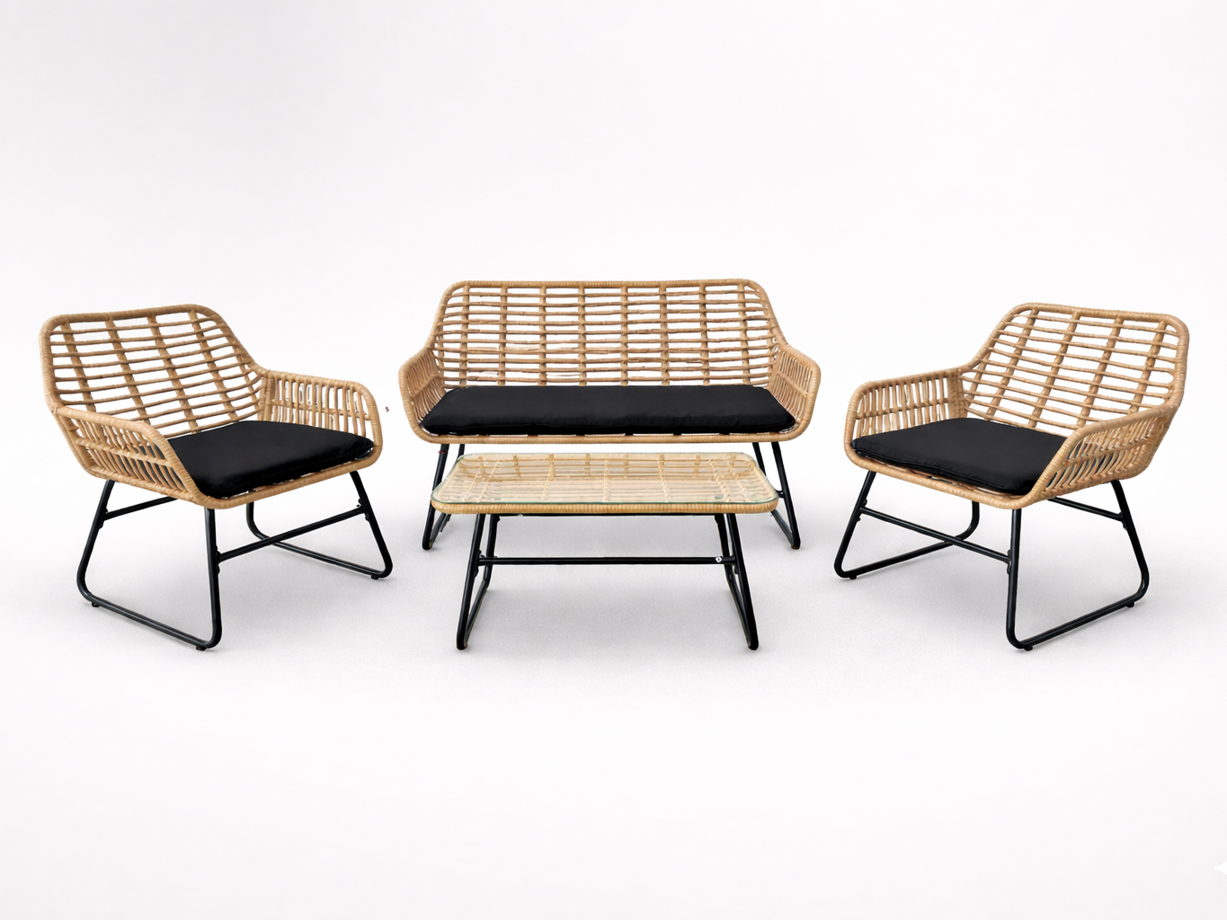 Stylowy i funkcjonalny zestaw mebli ogrodowych, który doskonale sprawdzi się na tarasie, w ogrodzie lub na balkonie. Solidna stalowa konstrukcja, elegancki rattan oraz wygodne poduszki zapewniają trwałość i komfort użytkowania. Szklany blat stolika dodaje elegancji i ułatwia utrzymanie w czystości.