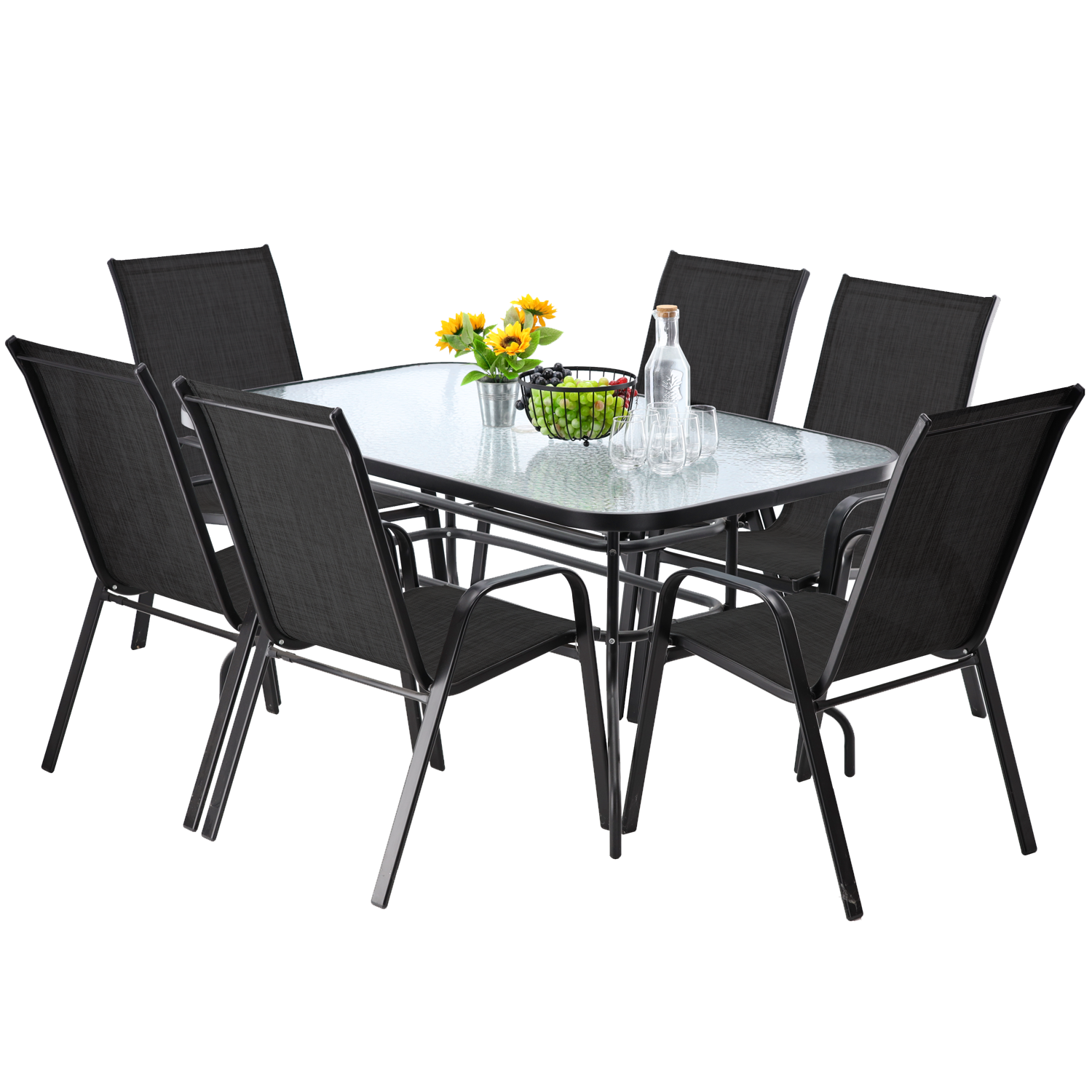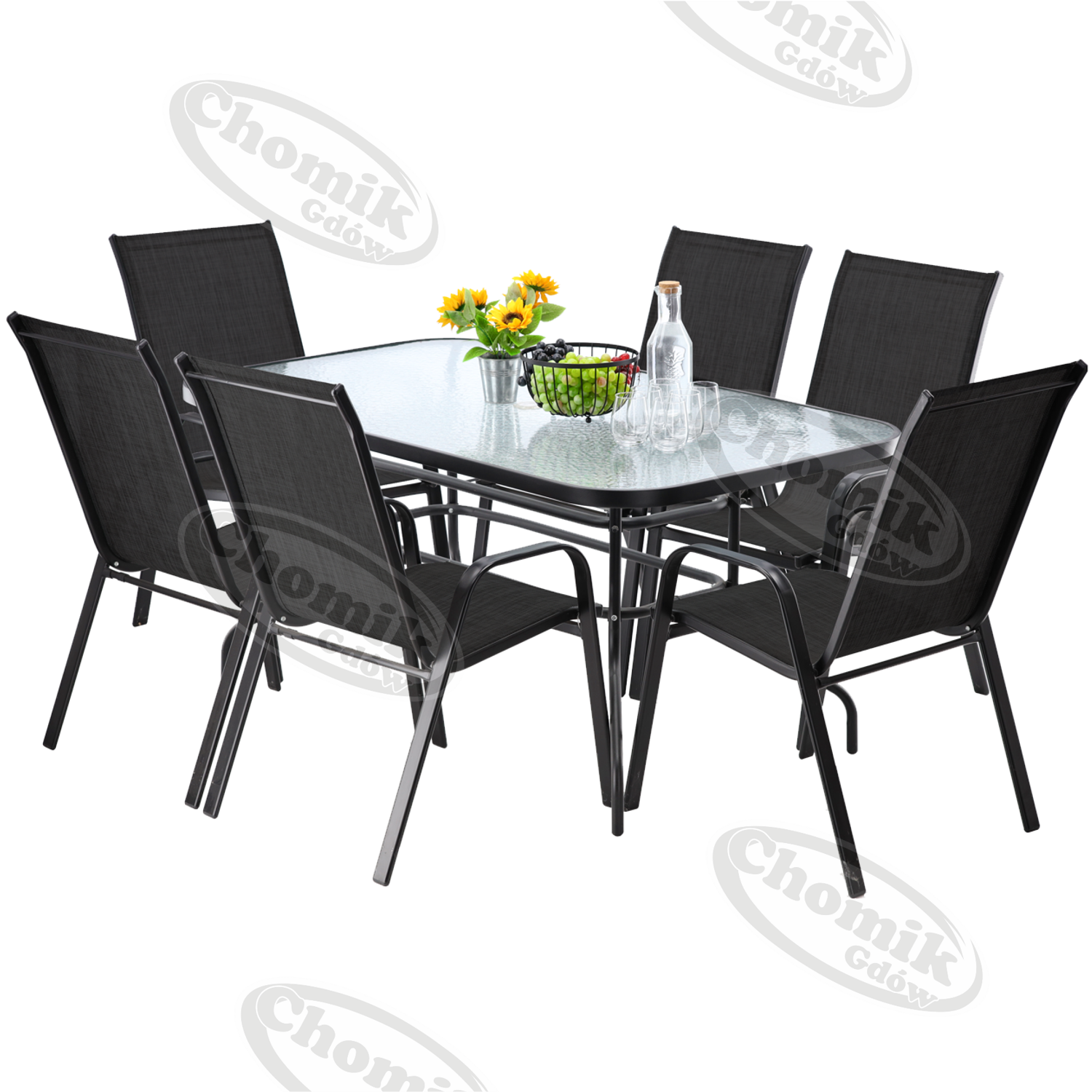 Komplet mebli ogrodowych jest idealny dla osób szukających połączenia klasyki z elegancją. Nierozkręcana konstrukcja krzeseł malowana proszkowo sprawia, iż są bardzo wytrzymałe. Stolik posiada hartowane szkło z teksturą przeźroczystej mozaiki (do samodzielnego montażu), co z pewnością pozwoli na wieloletnie użytkowanie.