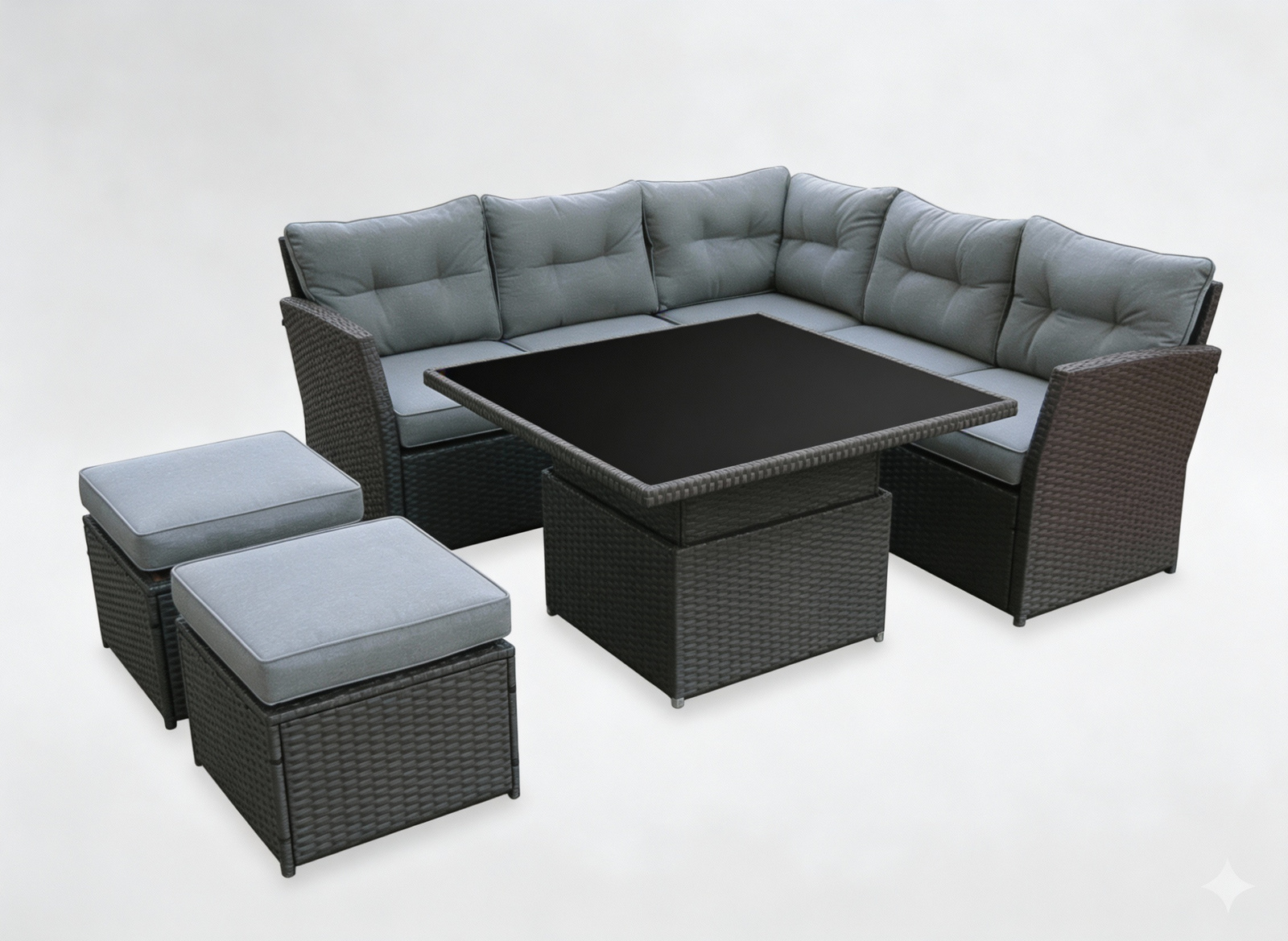 ZESTAW MEBLI RATTANOWYCH ( SOFA NAROŻNA + 2 PUFY + STOLIK Z REGULOWANĄ WYS. ) SZARY + SZARE PODUSZKI