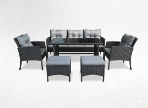 ZESTAW MEBLI RATTANOWYCH (SOFA, 2 KRZESŁA, 2 PUFY, STOLIK) – CZARNY, PODUSZKI – SZARY